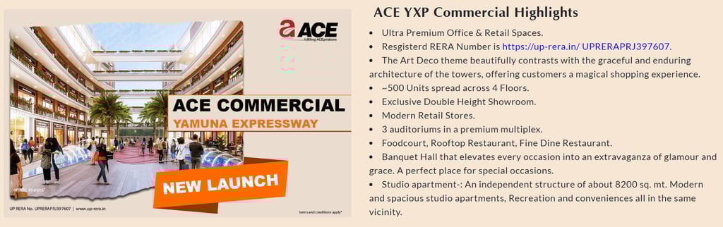 Ace YXP Commercial project area is 4 acres and total floor is 11. First to 6 Floors for commercial purpose only. All shops are divided into four floors Upper and lower ground, first and second floors and shops price list depend on floors.The 1st to 4th floors have 450+ shops And all available commercial shops for sale. 5th to 6th floors are for food courts, restaurants, multiplex, gaming zone,banquet and these are all commercial property for sale and 7th to 11 floors are for only studio apartments. Ace YXP new commercial project offering commercial shops, retail shops, retail space, commercial space like food courts & restaurants. Studio Apartments sizes are 766 To 1311 SQFT. Buy Double height shops available on lower ground floor & sizes are 870 to 3065 SQFT. Purchase Retail shops on lower ground to 2nd floor sizes are upto 1622 sqft maximum. Food courts shops on the 3rd floor with maximum size 1765 SQFT. Restaurants commercial space on 3rd & 4th floor sizes up to 4118 sqft. Multiplexes on 3rd & 4th floor sizes are up to 21013 sqft. The gaming zone on 3rd floor sizes are upto 22221 sqft. banquet on 4th floor sizes up to 21537 sqft. All kinds of Commercial shops available for sale with a nice price & rate. Ace yxp price & rate totally depend on floor preference. Ace YXP location Sector 22D Yamuna Expressway Greater Noida has additional advantages because too many ongoing & upcoming Top Projects are planned near to Ace YXP like Upcoming Jewar Airport, Upcoming Film City, Upcoming Olympic Park And The Buddha International Circuit. These all kinds of future developments are coming at yamuna expressway & creating an opportunity to purchase. Ace yxp new launch commercial project in prime location of yamuna expressway offering commercial property, commercial shop for sale, retail small shop for sale. Are you planning to buy a commercial shop? So explore one of the best Ace yxp commercial shop size, price list & rate, payment plan, location, brochure floor plan, site plan and more.. ACE YXP provides start-ups and major multinationals with the greatest business facilities,solid infrastructure, and remarkable design expertise to scale with excellence. ACE Yxp has been built by following principles of sustainability. This new age commercial property on lease provides multiple features which are not only rich and contemporary but viable as well. ACE YXP is more than just an iconic structure; it delivers shop buyers a sense of tranquillity and reliability as standard, across spectacular spaces that are effortlessly tailored to their every need. and represents a new approach to urban expansion.You can Discover the visionary commercial project in sector 22D Yamuna expressway Greater noida - Ace YXP transformative project serves as a catalyst for growth and a harmonious blend of high-end retail shops and coveted spaces ready to set a new benchmark in commercial real estate.Ace Yxp is the first retail and commercial project on a corner plot in Greater noida's greenest and most sought-after area Sector 22D Yamuna expressway – giving a new and distinctive shopping experience.Since its inception, the commercial project has created quite a stir in the community, and it is now regarded as one of the most successful and extravagant commercial centres in the Greater noida resion.