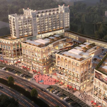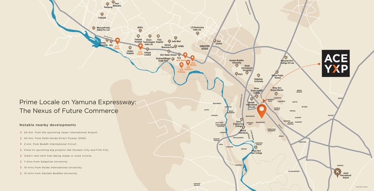 A pioneering modern lifestyle centre located on the Yamuna Expressway. ACE YXP is a first-of-its-kind commercial destination that consists of high-street retail, open-air restaurants, food court, next-generation gaming zones, premier multiplex, banquet hall, and upscale studio apartments. Its Art Deco-inspired design is strategically planned, featuring art installations, layered plantations, floral arrangements and bridges.